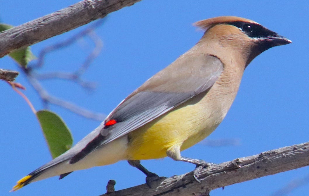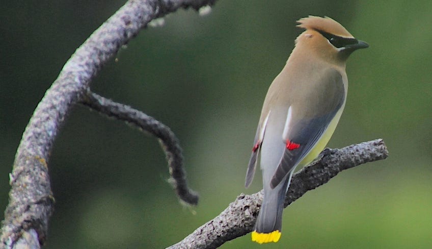 But then they started flying into the window. The berries had fermented. The birds were flying drunk. And, slightly horrified, I went out to assess. Sadly, one had hit the window so hard it was lifeless. But, wow, was it colorful: an incredibly sleek, mahogany body; a crest on its head above a black mask, with red wingtips of red and yellow tips on the tail. It was not the kind of detail you could notice until you were close and, holding it in my hand, it was really close, and really beautiful.