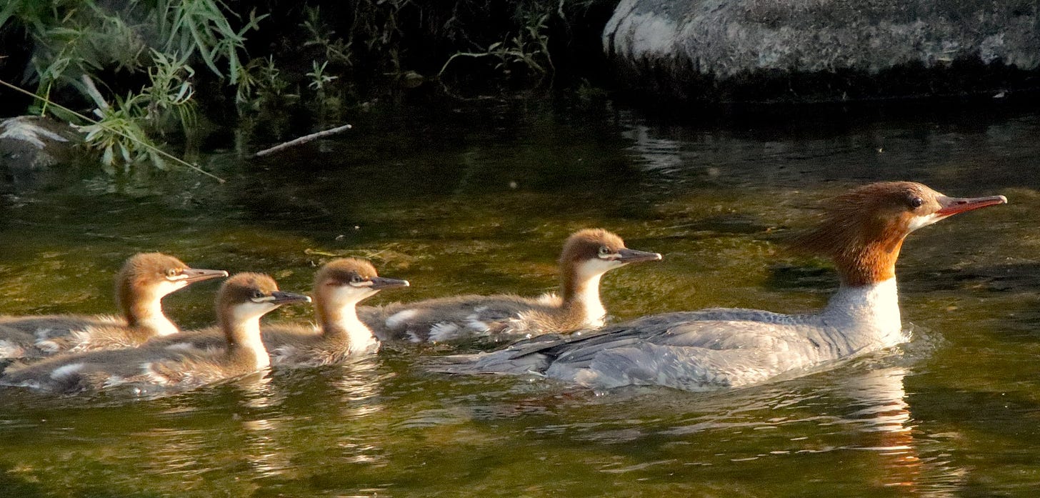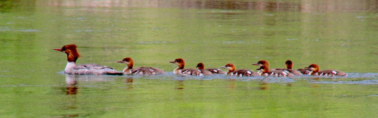 Merg mom at the front of a long brood on Latah Creek in early summer