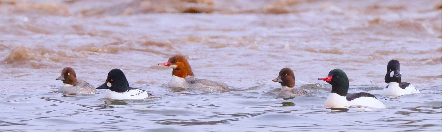 A merganser pair mixing with two pairs of Goldeneye ducks in the rough waters where muddy outflow from Latah Creek enters the Spokane River