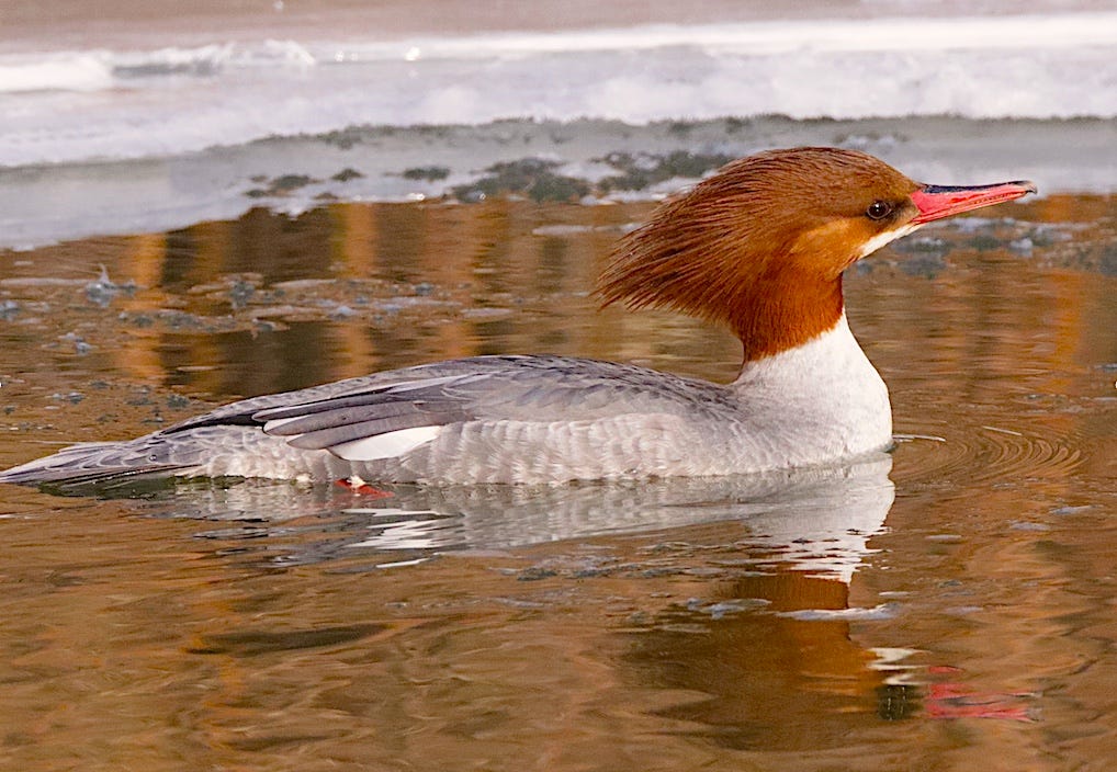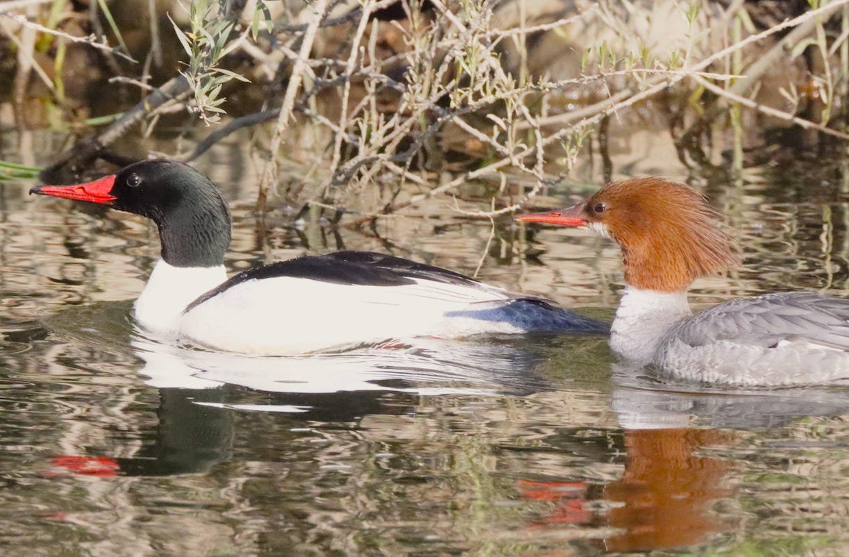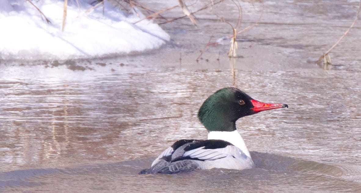 I honestly don’t know the story about how Common Mergansers got slapped with the adjective “common” in their names. They’ve never seemed common—or at all ordinary—to me.