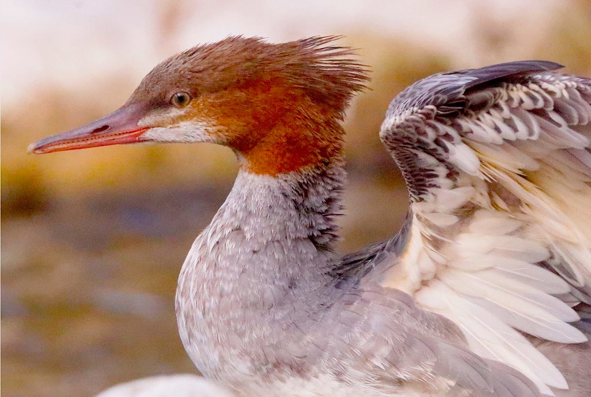 Mergansers are people shy, but not as shy as some of the other diving ducks they sometimes hang out with (i.e. Buffleheads and Golden-eye ducks). The males are more skittish than females, and harder to photograph (well) because without good light their eye-bead blends gets lost in their dark green hoods and, as a photographer, I’m always trying to make the eyes of my critter subjects visible. It’s a bit easier with the females who, as a rule, are more approachable, with somewhat more visible eyes.