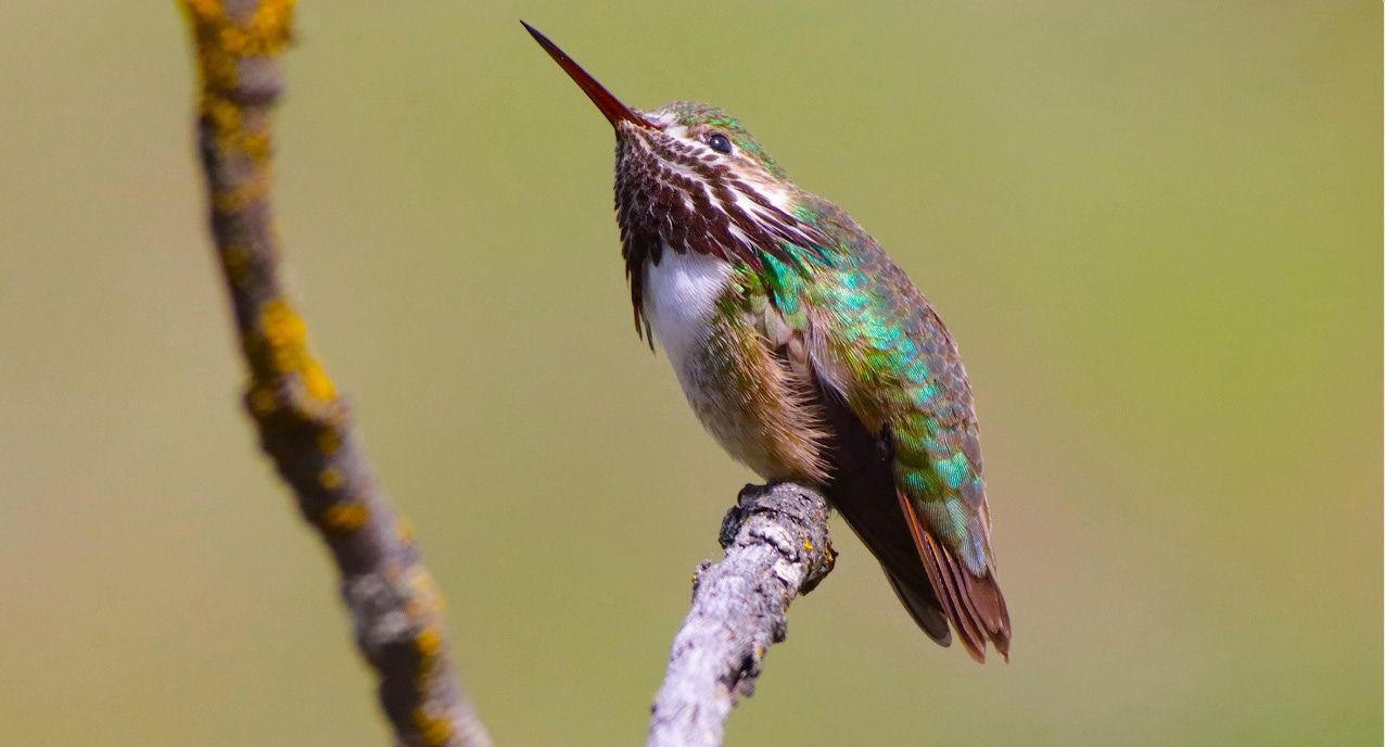 A pensive Calliope hummingbird (the size of a normal thumb) on its perch in the Spokane River gorge