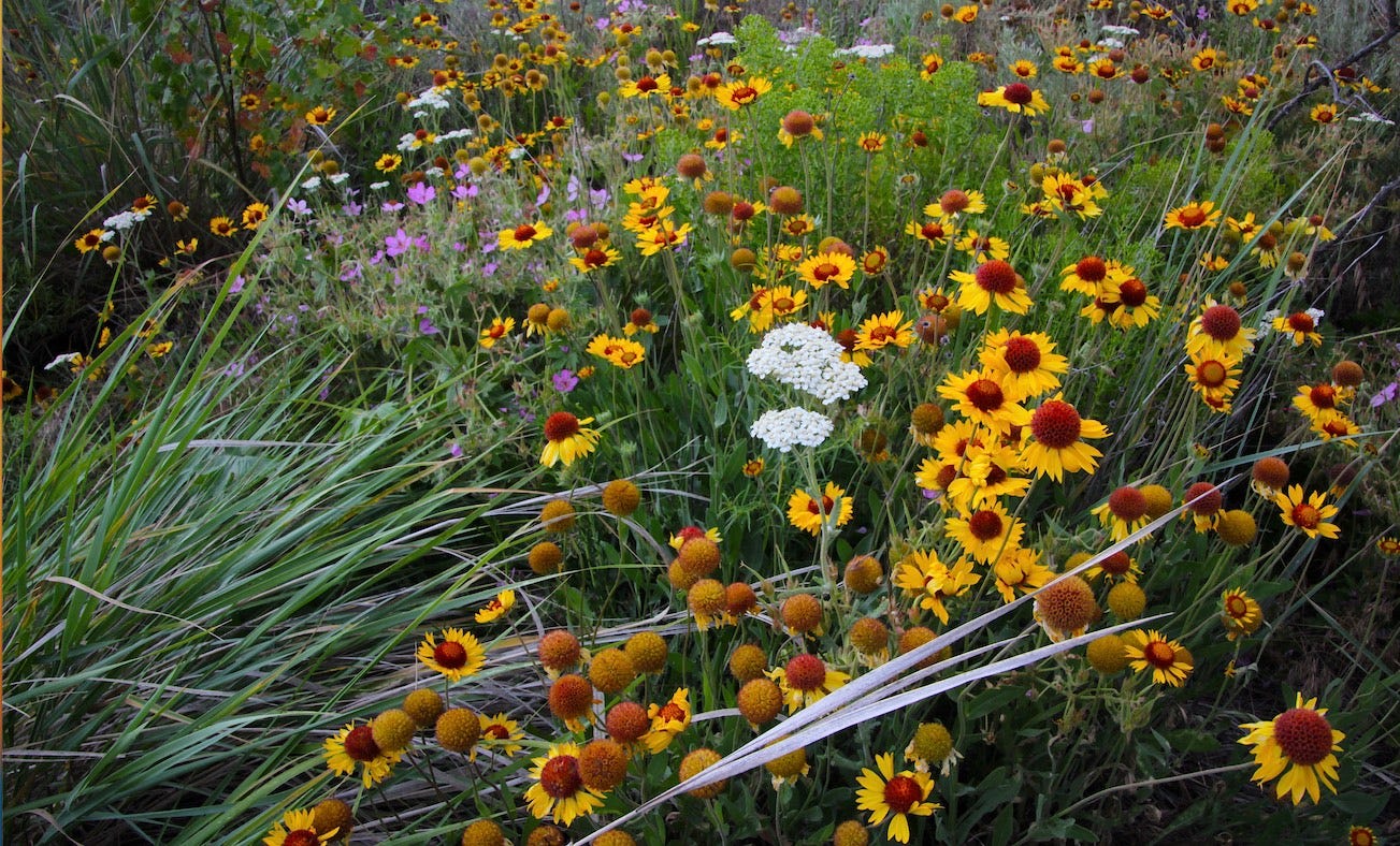 Yarrow elbowing up amid blanket flower and sticky geranium