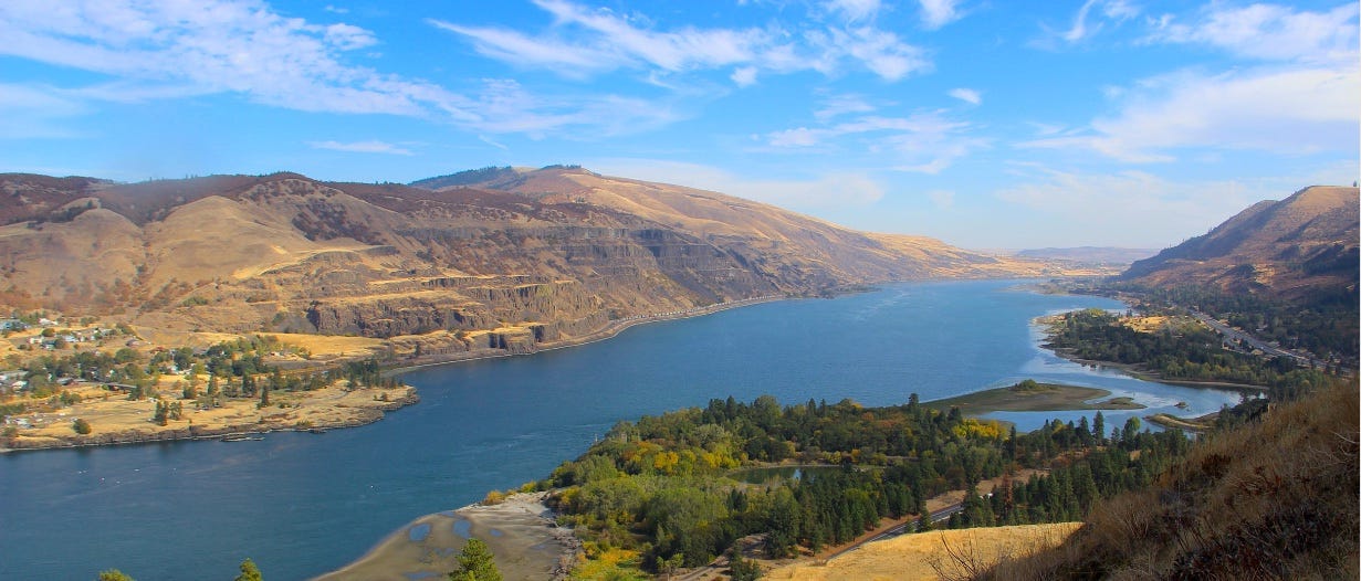 The sweep of the Big Eddy in west Spokane, looking northward, with the deep bowl on the left and rapids to the right.