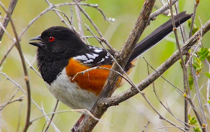 Rufous-sided towhee in its thicket