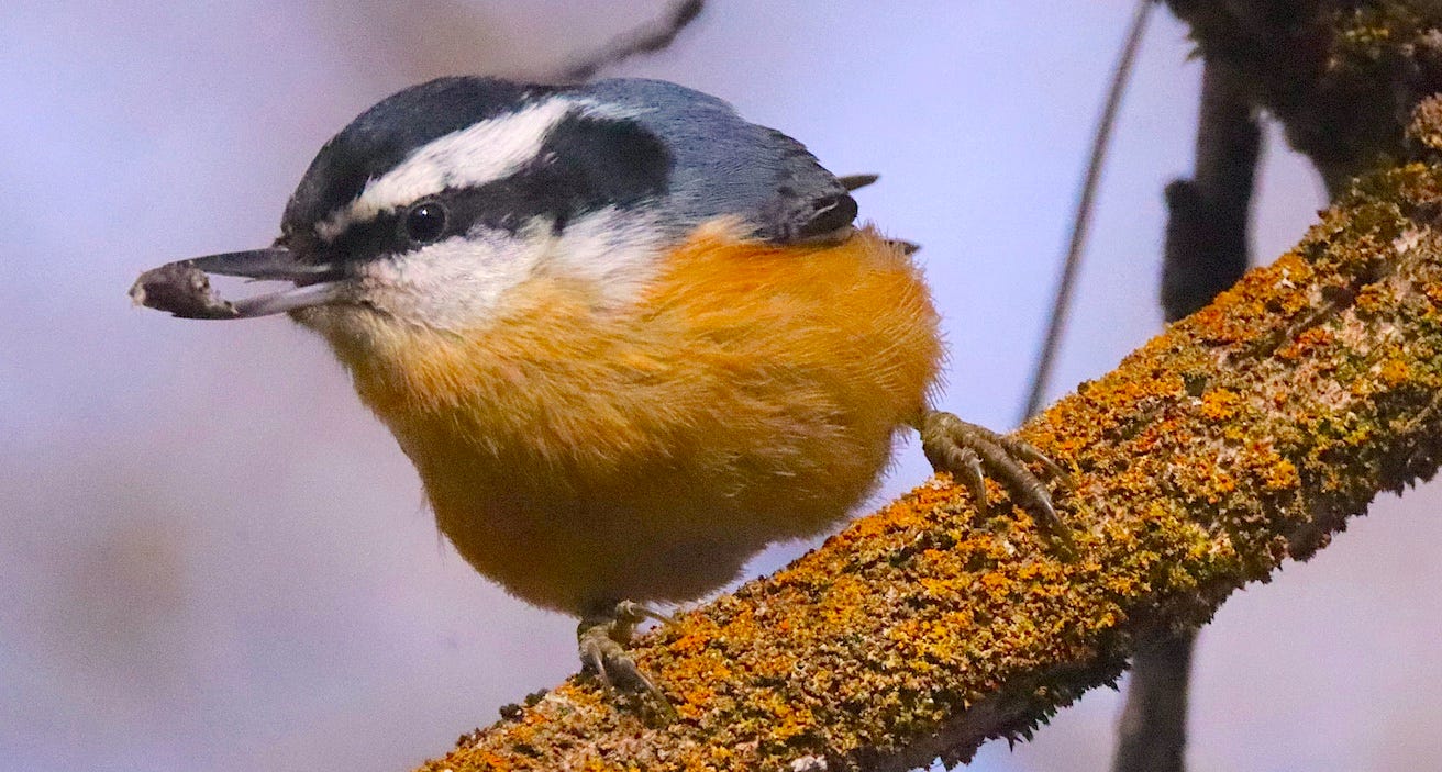 In the forest, a Red-breasted Nuthatch snatches a seed