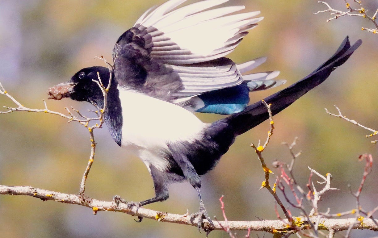 Magpie in nest building mode, carrying a wad of mud to mold an inner sanctum.